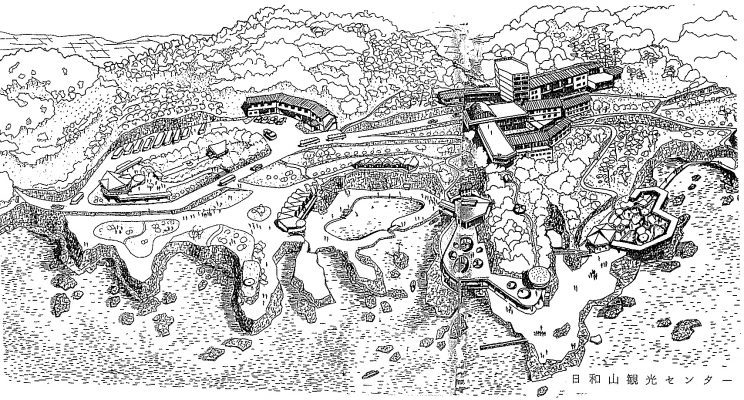 1959(昭和34)年の秋、兵庫県の城崎温泉街から20分くらい北側の日和山海岸地区で小さな旅館を経営しているご主人から西山先生に「ひと回り大きな観光開発をしたいので計画案を描いてほしい」と相談がありました。兵庫県下では西山先生はよく知られていました。先生は兵庫県の観光関係の委員をしたり、姫路城の入り口広場にある迎賓館を設計したりしていました。迎賓館は木造本格和風で豪快さを感じさせる先生の数少ない建築作品の一つです(現存)。また、城崎町ではまち並み風景から見ても大切な外湯めぐりの各温泉の改築や新築の設計を指導していました。一番目立つコーナーの地蔵湯は和風とコルビュジェ風が混ざった、何ともへんてこなデザインでしたね(笑)。