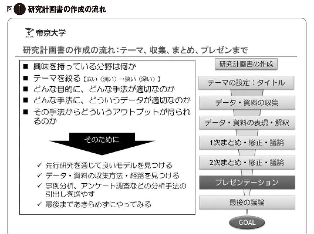 本ゼミは、「問題意識からテーマの設定、文献調査やヒアリング調査を通じてレポートを作成、プレゼンテーションの実施」の順に進めていくが、方向性ややり方、文書の書き方、プレゼンテーションの仕方など、学生の立場では慣れていないことも多い。従って、段階ごとに適切な指導や誘導が必要とされる。そのため、研究計画書を作成してもらい、それに基づいて先生と話し合い、研究の方向性や研究方法、さまざまな調査結果の解釈などについて適切なアドバイスをもらい、研究を進めていくことが重要である。研究計画書は、研究内容だけではなく、スケジュールに沿って進めることにも役に立つため、非常に重要性や活用性が高い。プレゼンテーションにおいては、与えられた時間内に自分の成果や考え方を発表することで、論理的かつ効果的に自分の意見を発言する機会となる。