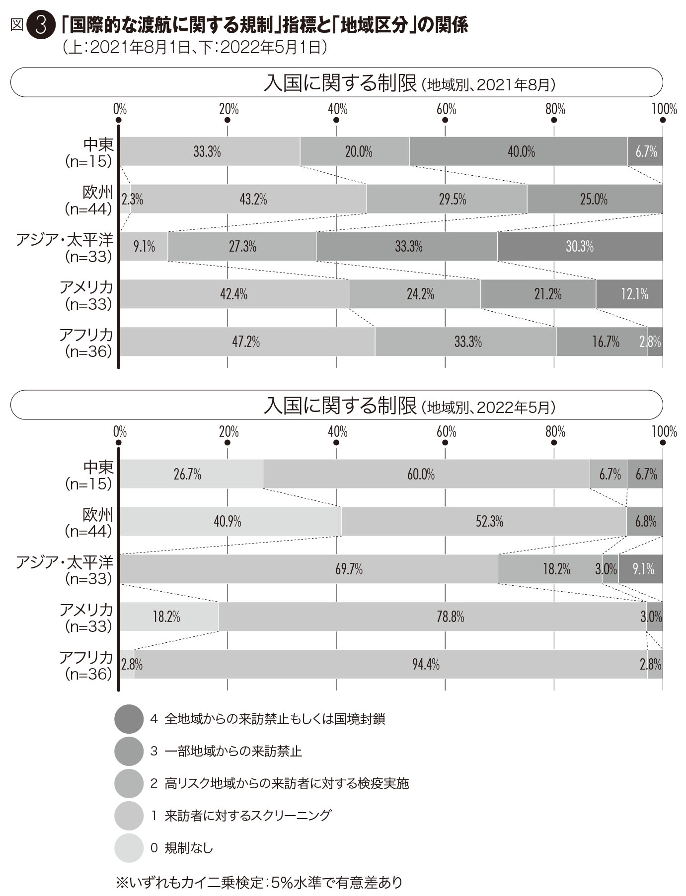 このことから、「国際的な渡航に関する規制」指標は地域によって差があり、全体として「アジア・太平洋」の国はそれ以外の国と比較して「国外からの入国に関する規制」について、より厳格に対応している傾向があることが改めて確認できる。