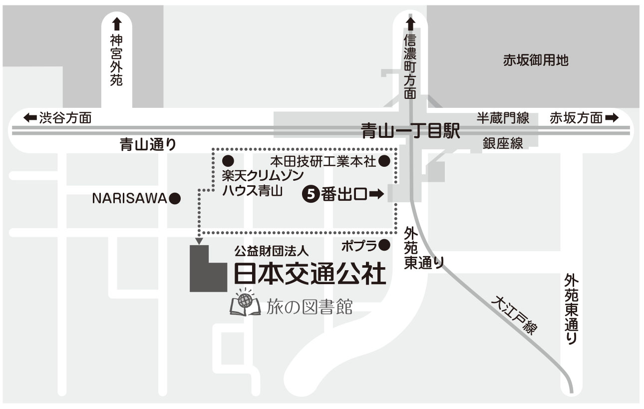 ●外苑東通りからお越しの方…コンビニエンスストア『ポプラ』の角を西に曲がり、2つめの交差点を越え、約10m先左側が日本交通公社ビルです。