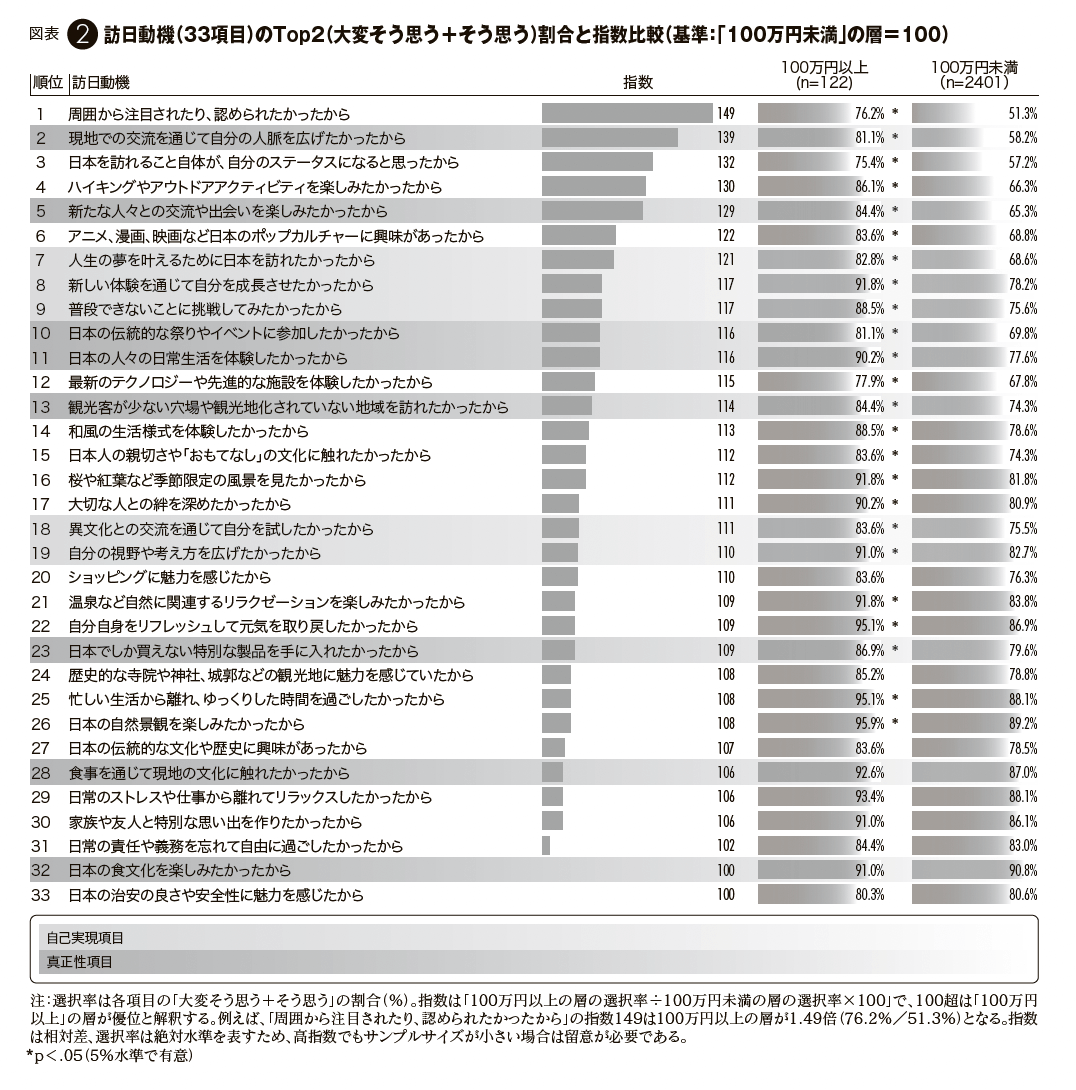 さらに、この傾向をより具体的に把握するため、訪日動機33項目について、5段階評価のTop2の割合(5…「とてもあてはまる」と 4…「ややあてはまる」の合計)と、これを「100万円未満」の層を100とする指数を算出した。すると、両者の違いがより明確になった。