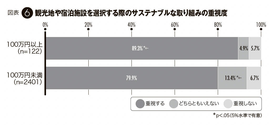 「100万円以上」の層は「サステナブルな旅行を重視する」という考えに賛成する割合が89・3%に達し、「100万円未満」の層の79・9%を有意に上回る結果となった(図表6)。