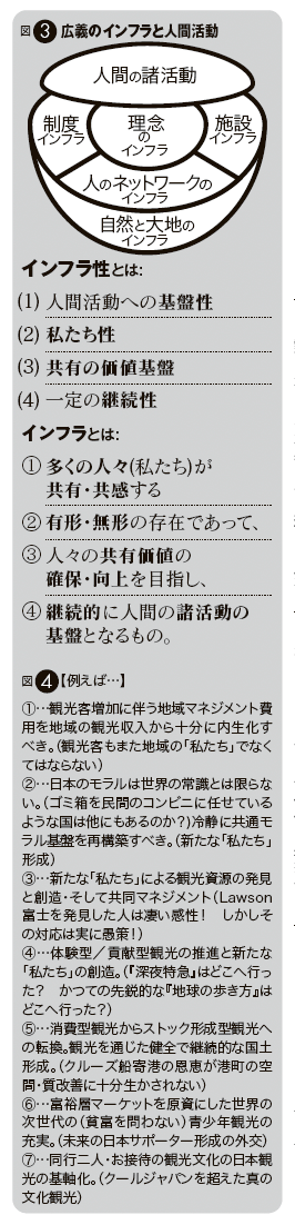観光の本質は、観光立国推進基本法の前文が謳うように根本的にインフラ性が高いものだが、その現状を見ると「私たち」としての一体性は希薄で、共有価値基盤も脆弱であり、必ずしも「インフラ性」が高いとは考えにくい。