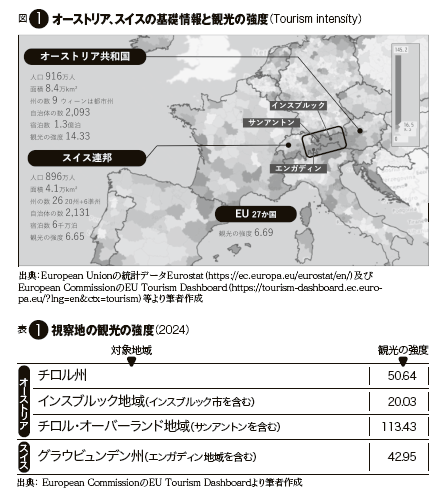 本題に入る前に、今回視察した地域の概要を示す。オーストリアとスイスはいずれも連邦制を採り、分権度合に違いはあるものの、州と自治体の自治権が強いのが特徴である。面積は日本より小さいが、自治体数はそれぞれ2000を超える【図1】。今回訪問した地域は、オーストリアのインスブルック、サンアントン、スイスのエンガディン(そのうち主にサンモリッツとポントレジーナ)の3地域である。