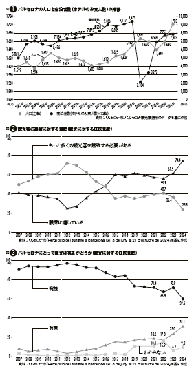 そして1993年にはバルセロナ観光局が設立され、アントニ・ガウディの建築群などを中心とした文化や芸術に焦点を当てた戦略が推進された。その戦略が功を奏し、観光客数が順調に増加する一方で、住民との関係性は変わりつつあった(図❷〜❸)。実際に、市が毎年実施している住民意識調査の結果をみても、観光客の誘致について限界に達していると回答する住民の割合が2016年を境に上回り、2024年には74・4%となっている。また、バルセロナにとって観光が有益かどうかという設問についても、有益と回答する人の割合は年々下がっている。