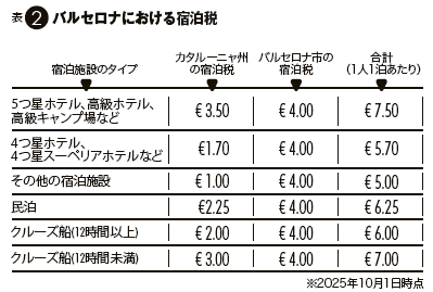 カタルーニャ州が2012年から徴収している宿泊税(IEET)については、2020年の州法の改正によって、その使途が従来の観光振興に加えて市民生活の質の向上にも充てられるよう拡大された。この法改正に基づき、2021年6月からIEET にバルセロナ市独自の追加宿泊税を上乗せする形で徴収が開始された。2025年10月現在は1人1泊あたり4€(原則として最大7泊分まで、16歳以下は免除)であるが、段階的に引き上げが行われて現在の税額となっている。