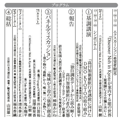 パネリストとして、3県7市町村の広域連携によるブランディングを行う「雪国観光圏」の代表理事であり、雪国文化を体験できる宿泊施設「ryugon」を運営する井口智裕氏、長野県佐久市で酒蔵に泊まって蔵人体験ができる「KURABITO STAY」を運営する田澤麻里香氏、100名以上の能楽師が在籍する京都市で、主に海外に向けて能楽と能楽文化を発信普及する事業に取り組む山根樹氏、奈良で体験プログラム「kurabi」を展開する「Tale Navi」の鬼木翔平氏の4名と、コメンテーターとして、「インバウンド戦略研究所」の清水泰正氏、モデレーターとして当財団京都事務所長を兼任する福永香織主任研究員が登壇し、地域が主役となって、いかに高付加価値観光を実現するかについて議論しました。(井口氏、田澤氏はオンライン参加)